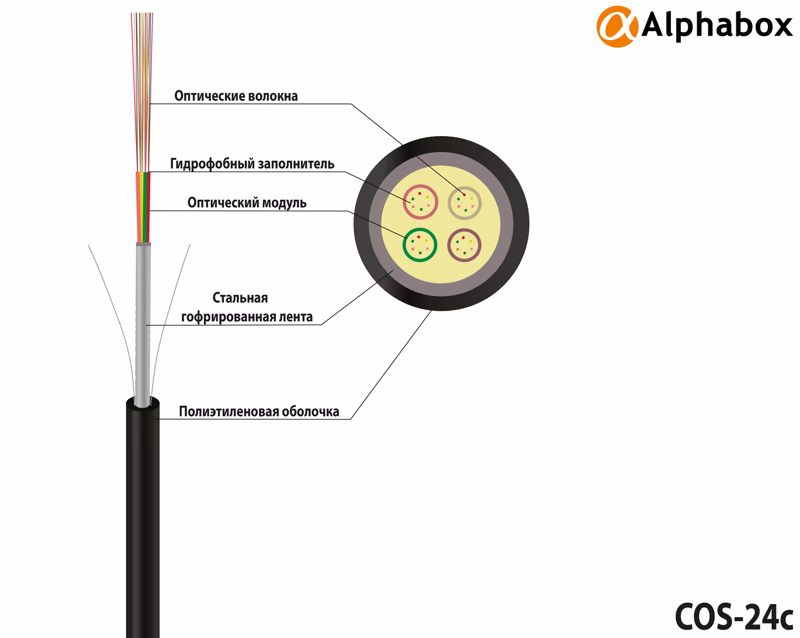 Оптический кабель Alphabox COS-24c/4*6c-6/8.8mm/2.7Kn для канализации обеспечивает надежность создаваемой линии связи. Прокладка кабеля в канализации требует дополнительной защиты кабеля от внешнего воздействия.Виды защиты кабеля от внешних факторов: