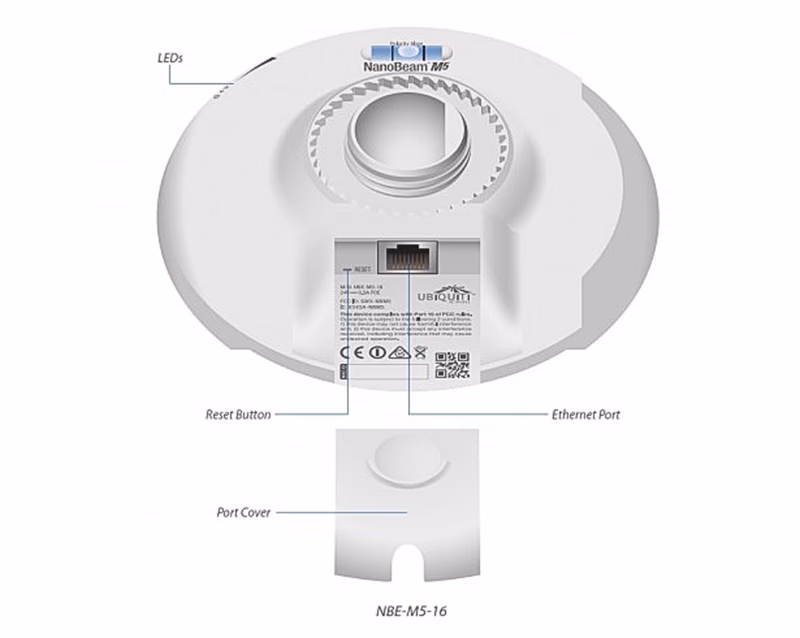 Устройство представляет собой мощную точку доступа на параболической антенне. Разработчики добились компактного размера, маленького веса самого устройства, но при этом высокой мощности и высокого коэффициента усиления. Новая линейка в отличии от предыдущих устройств имеет усовершенствованное крепление, с помощью которого можно поворачивать антенну для лучшей калибровки. Еще NanoBeam M5-16 оборудован процессором Atheros MIPS 74KC на 560 МГц и оперативной памятью на 64 Мб, что в 2 раза больше предшественников. POE инжектор позволит запитать устройство по витой паре. Питание подается через порт 10\100Mpbs, а сам порт размещен под крышкой на облучателе. Отличается от серии NanoBridge наличием радиопрозрачного колпака. Суть которого в защите облучателя от наледи зимой. Wi-Fi передатчик имеет мощность 400мВт и передача происходит в полосе 5GHz. Хорошие результаты в организации беспроводного соединения дает интегрированная антенна на 16dBi и технология MIMO 2×2.